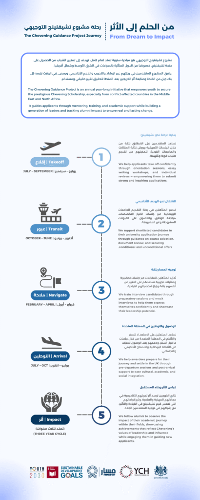 We are excited to announce the launch of the fifth stage – Follow-up and Impact Stage of the Chevening Guidance Project 2025 by The Yemen Chevening Hub.